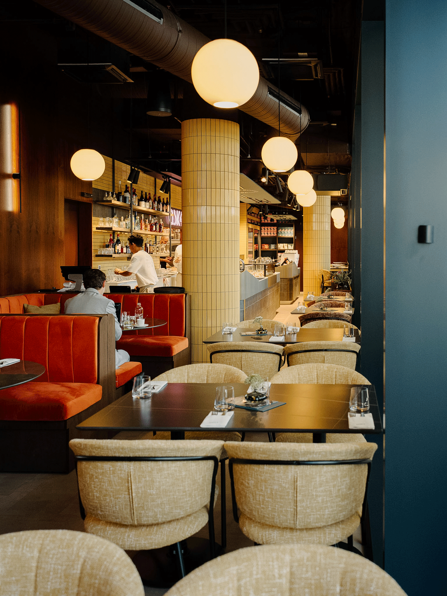 V poledne se bistro promění v živé městské místo s obědy a kreativním denním menu, které se odpoledne plynule přelévá do uvolněného rytmu s vínem a dezerty.