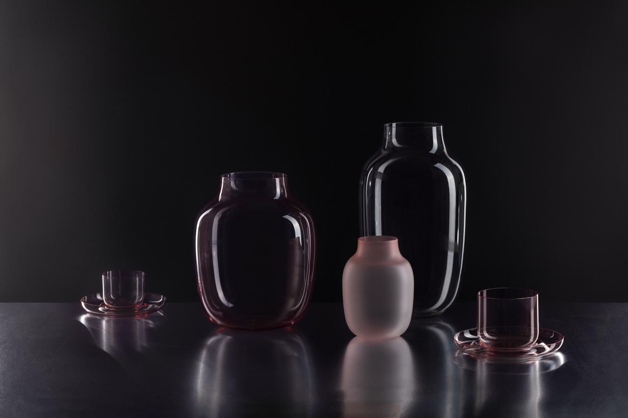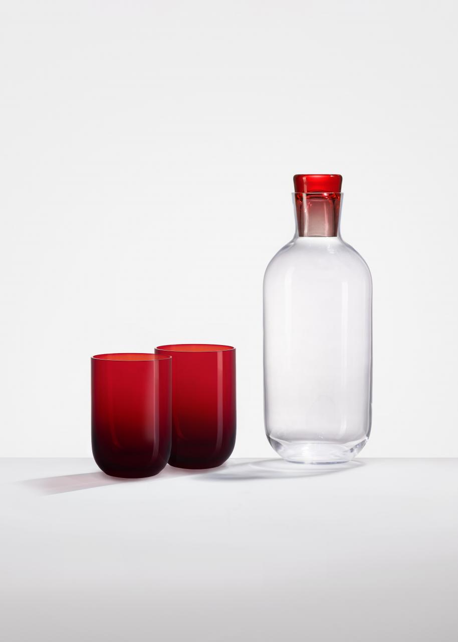 Kolekce Vial v rubínovém provedení zahrnuje láhev se skleněnou zátkou a sklenici na vodu. Minimalistické linie a subtilní proporce nechávají vyniknout čistotu materiálu, zatímco barevný akcent dodává celku jemnou osobitost.