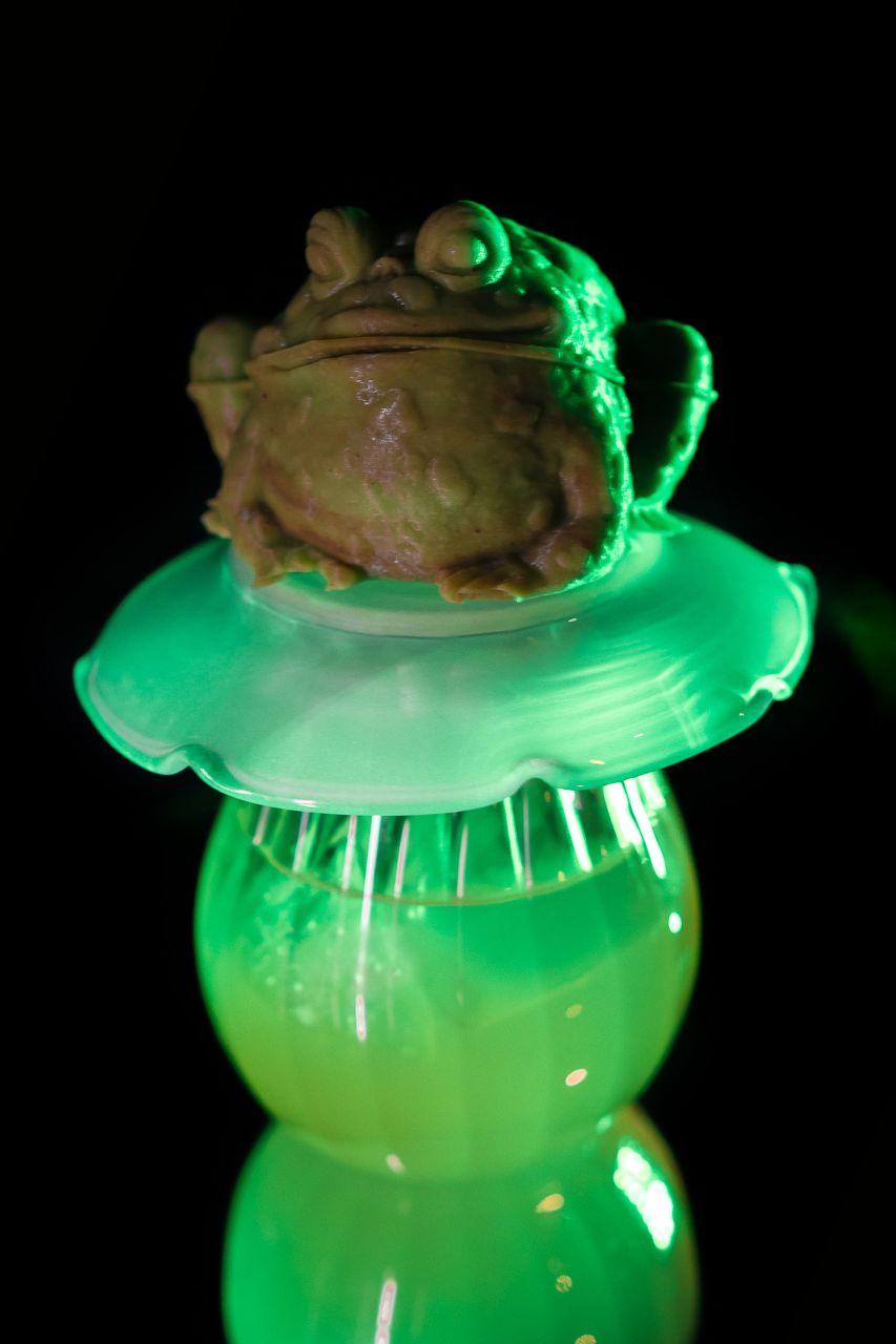 Sklenici korunuje malá zelená žába, na první pohled roztomilá, ale s překvapivým úkolem – host si z jejího hřbetu nejdřív musí slíznout prach z lyofilizovaného ananasu a pepře timut. „Ananas má takový nabourávající efekt a timut funguje, jako když olízneš baterku, takže to evokuje pocit, jako když v Amazonii olízneš jedovatou žábu,“ vysvětluje Michal, zatímco přihlížející hosté se smějí a fotí si svůj první zážitek z čtvrté dimenze.