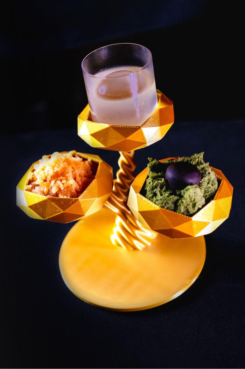 Triple Tree Cip uzavírá naši cestu napříč dimenzemi s veškerou pompou, kterou si Super Panda Circus rozhodně může dovolit. Výpravný servis připomíná třípatrový strom vytištěný na 3D tiskárně – futuristickou bonsaj, kde každý level skrývá jinou součást zážitku. Jedno patro patří samotnému drinku, další mezcalové pralince a poslední jemné granitě z meruněk a praženého japonského čaje hojicha. Vše dohromady tvoří kompozici, která se nedá jednoduše zařadit – spíš než koktejl jde o performanci v několika dějstvích.