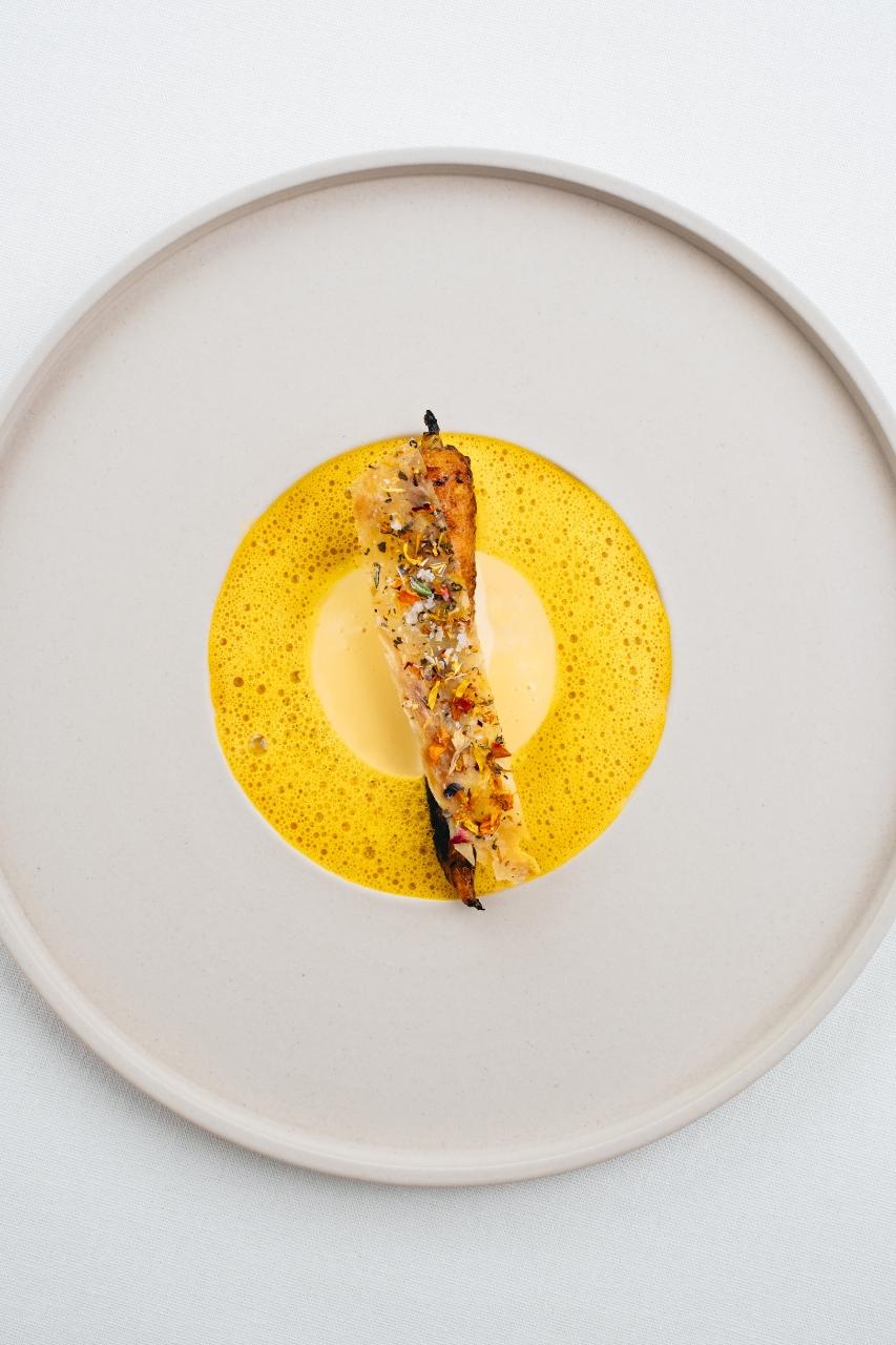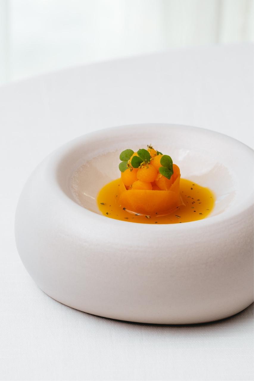 Na talíři leží mrkev marinovaná dvanáct hodin v pastě z fermentované zeleniny, následně grilovaná a lehce zauzená. Kolem se rozlévá napěněná holandská omáčka, v níž se mísí meruňková sladkost, mrkvová šťáva, houby a rakytník – kombinace, která přináší překvapivou hloubku i svěžest.