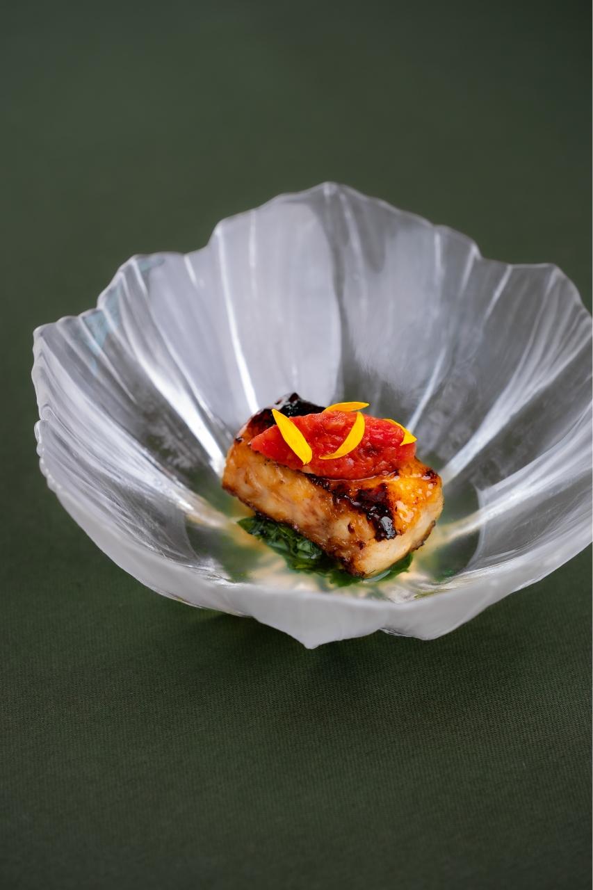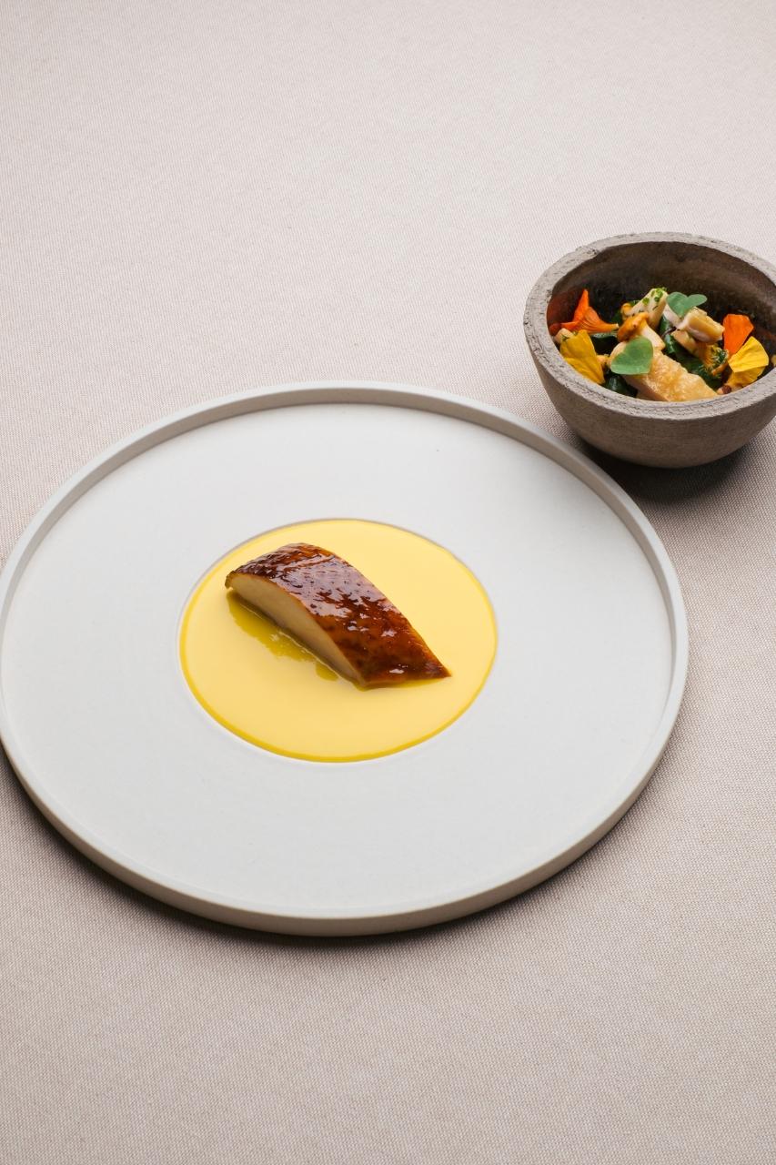 Výsledkem je pokrm s naprostou rovnováhou – mezi ohněm a vodou, sladkostí a kyselostí, teplem a mineralitou. Je to moment, kdy se Tilingerův rukopis ukazuje v plné síle: kuchyně, která dokáže být přesná, technická, a přitom hluboce poetická. Rozhodně se jedná o jeden z vrcholů večera.