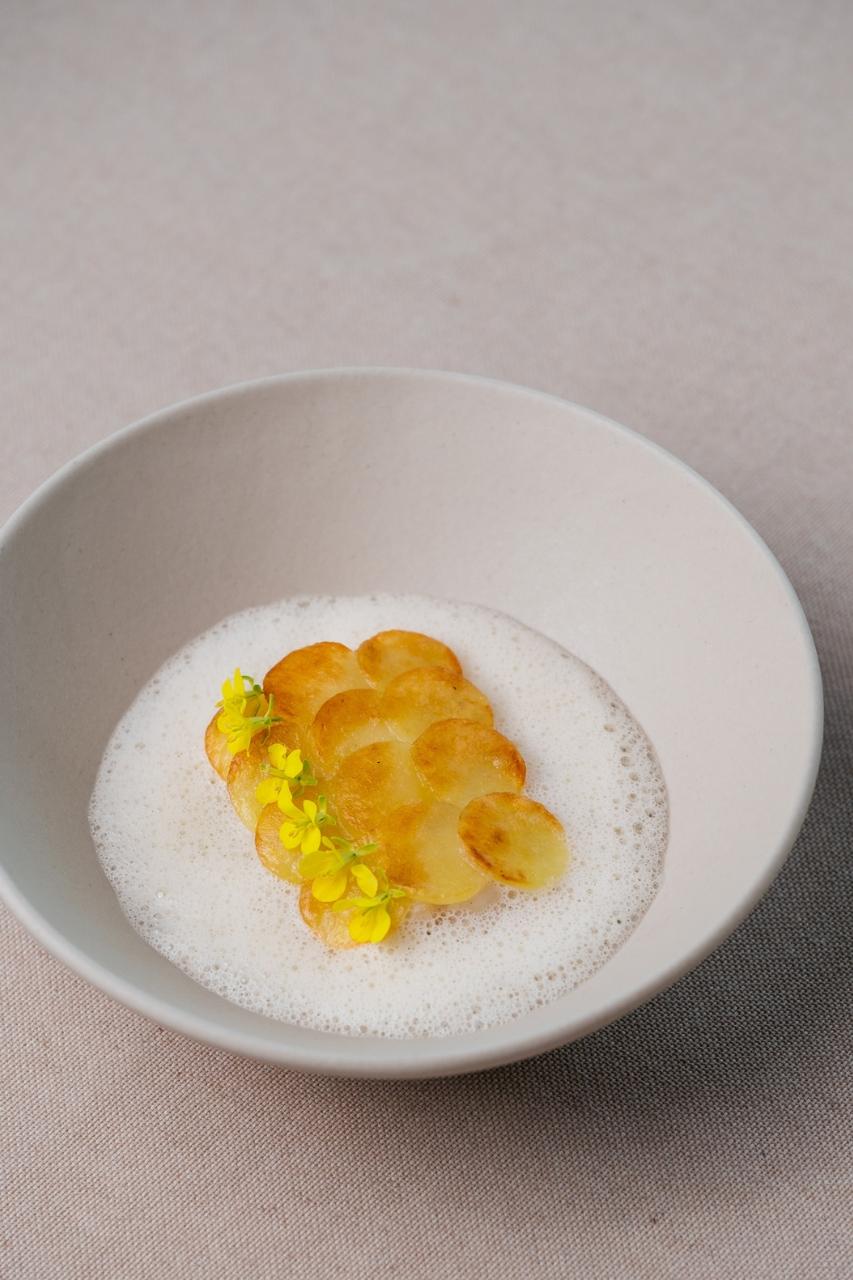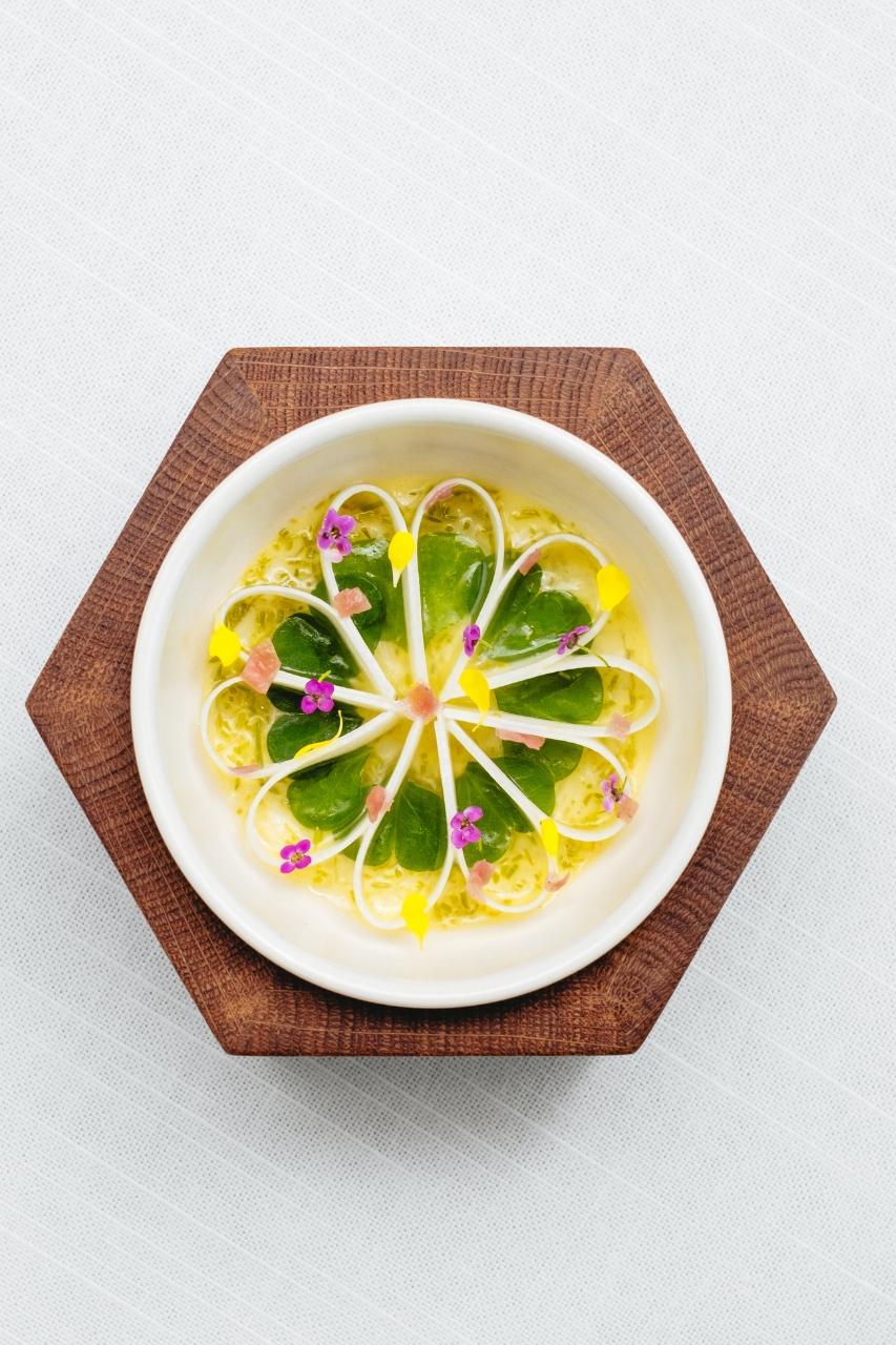 Na talíř přichází první pokrm večera: královská hlíva. Podává se za studena, doplněná jemným krémem z klobouku houby a napařenou nohou nakrájenou tak, aby si zachovala strukturu i masitost. Cibulové consommé propojuje sladkost, umami a lehkou bylinkovou kyselinku. Citronová verbena, pažitka a křehké chipsy z odřezků hlívy dodávají pokrmu svěžest i texturu.