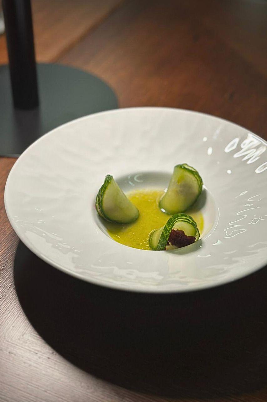 První oficiální pokrm obsahuje nakládané plátky okurek, fermentovaný černý rybíz, kandovanou višeň a zauzený jogurt, vše dokončené okurkovým dresinkem se smrkovým olejem. Spojení svěžesti a zemitosti vytváří komplexní chuťový zážitek s jemnou lesní poetikou.