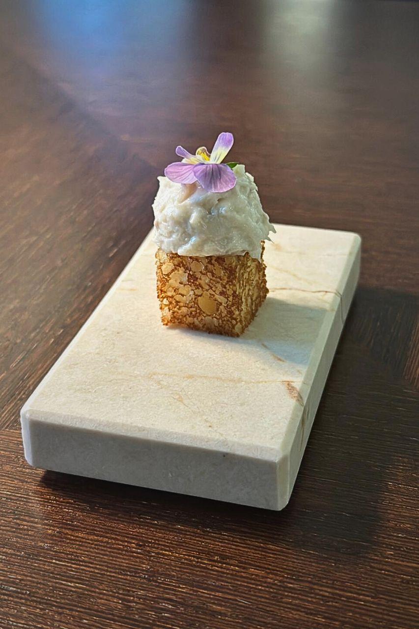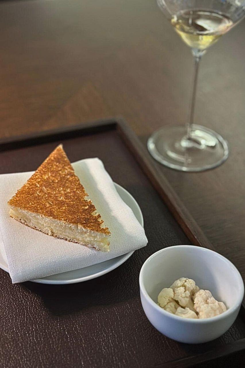 Druhý amuse bouche s bylinkovým máslem, smaženými šneky a pěnou z vepřové šunky přináší jemnost a lehkost. Třetí sousto, sýrový sendvič doplněný květákem na kyselo, dokonale uzavírá úvodní kapitolu večera. Kyselost je vyvážená a textura příjemně křupavá – tradiční složky jsou podány v moderní interpretaci.