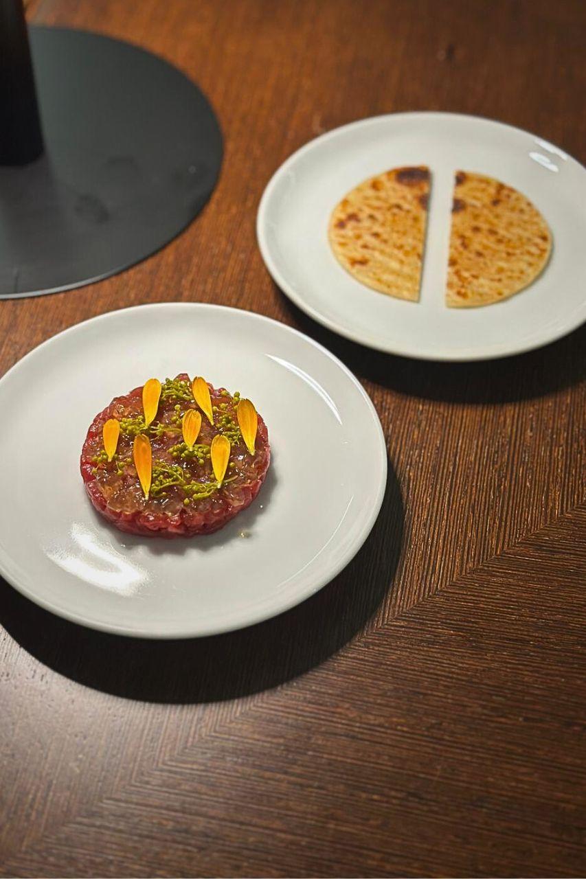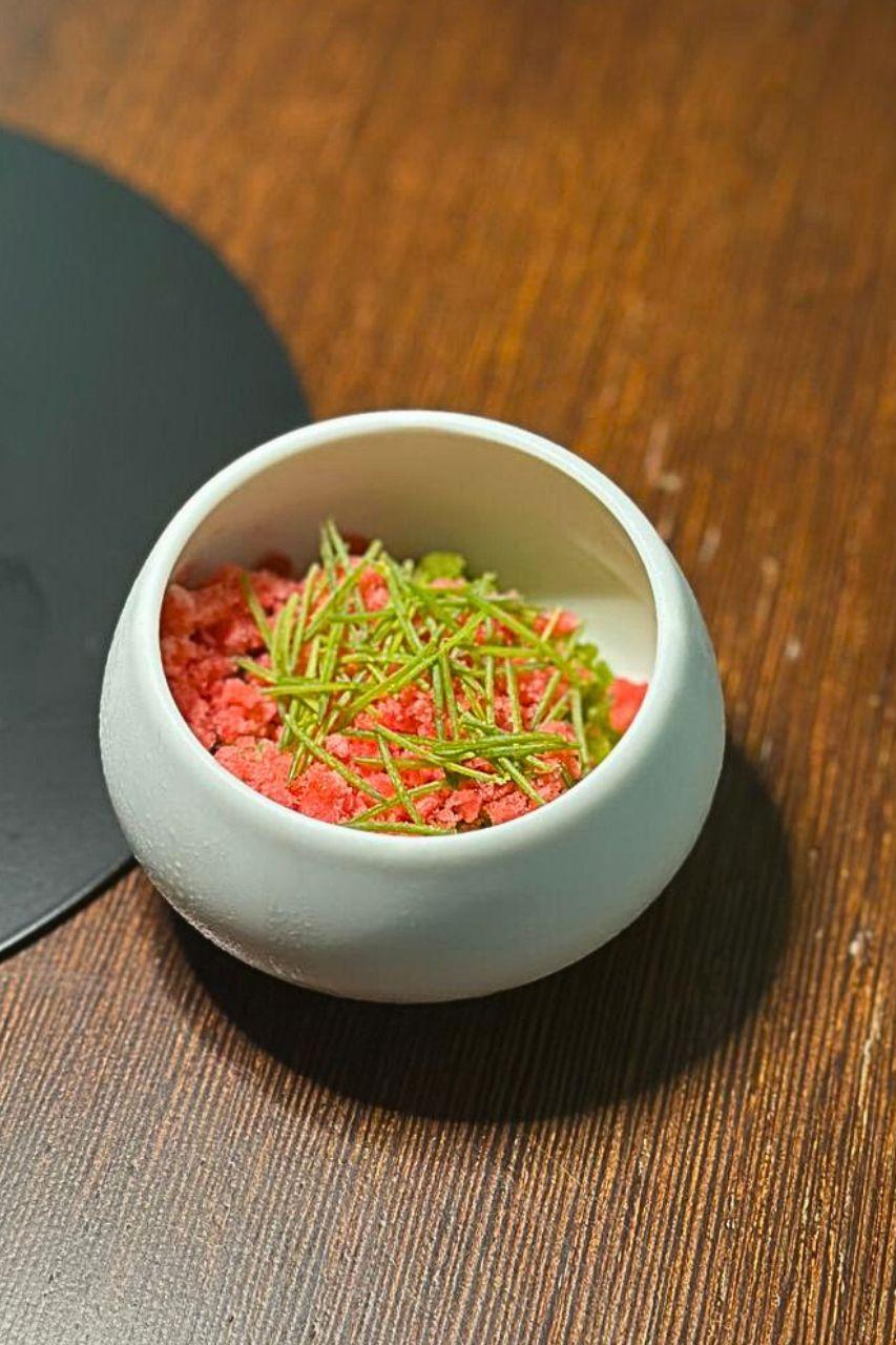 Dalším vínem je Rosé Bočky, staré keře 2021 od J. Stávka, které přináší plné tělo a ovocnou složku, jež doplňuje hovězí tatarák připravený z masa z Farmy Rudimov. Pod masem se nachází bezová majonéza a nahoře želé z bezu, vedle je velmi zajímavý nezralý nakládaný bez a placka z fermentovaných brambor. Jemná, hutná jahodová šťáva s lístky čerstvé verbeny, jakožto nealkopairing, dodává pokrmu svěžest a citrusový tón, který harmonizuje s výrazným tatarákem.