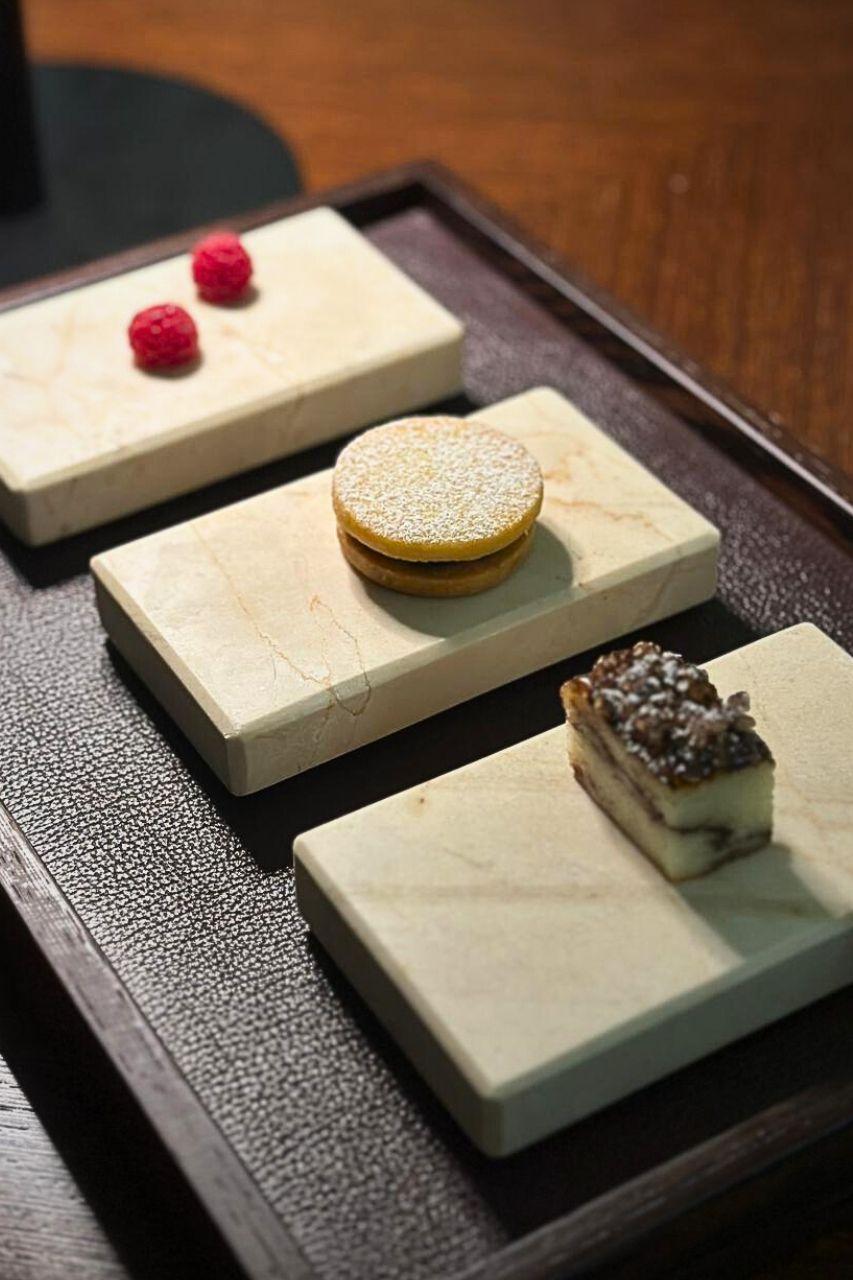 Ještě před petit four přichází ochutnávka vlastních likérů – višňového, mandarinkového a růžovo-kořeněného, elegantně servírovaných. Na závěr petit four – kupičková kaše s jablečným karamelem a pufovanou pohankou, linecký koláček s makovou náplní a povidly z dřínky a nakonec maliny ze zahrádky restaurace Essens – drobnosti s osobitým charakterem a symbolickou tečkou za večerem.