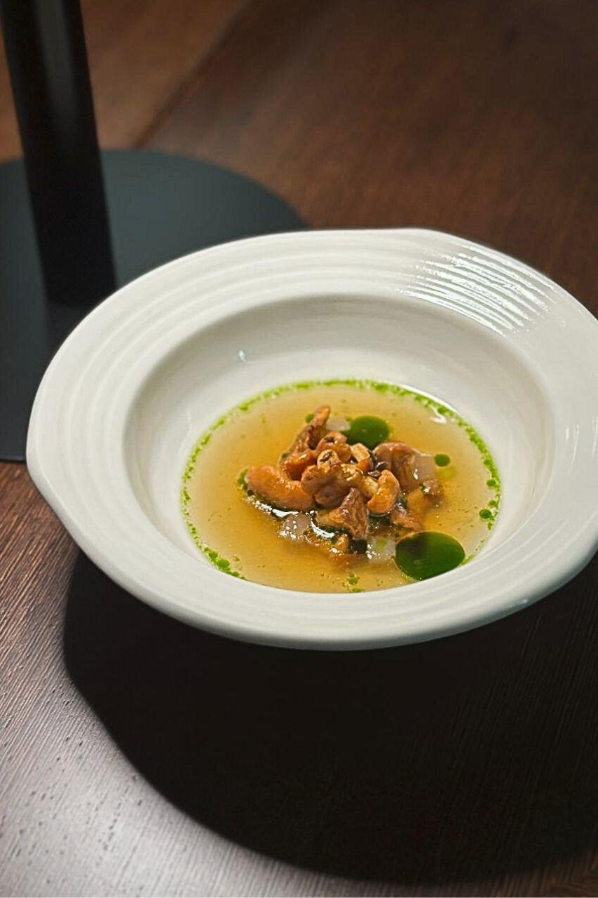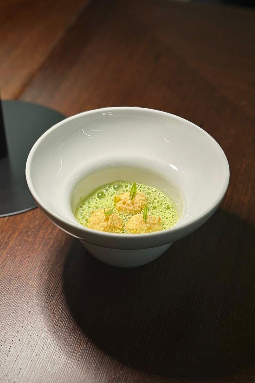 Následuje kombucha ze zeleného čaje, jakožto nealko, která nabízí čistou, bylinkovou a lehce citrusovou chuť. Dalším vínem Vína de Martin 2021 Luis Anxo Rodriguez Vazquez ladí svou jemností a strukturou. A konečně přichází pokrm, složený ze zálivky z řapíkatého celeru a jablka, majonézy z celeru, sýrovo-tvarohových knedlíčků obalených v lískovém oříšku a citronové verbeny. Pokrm působí svěže, zahradně, s decentní elegancí.
