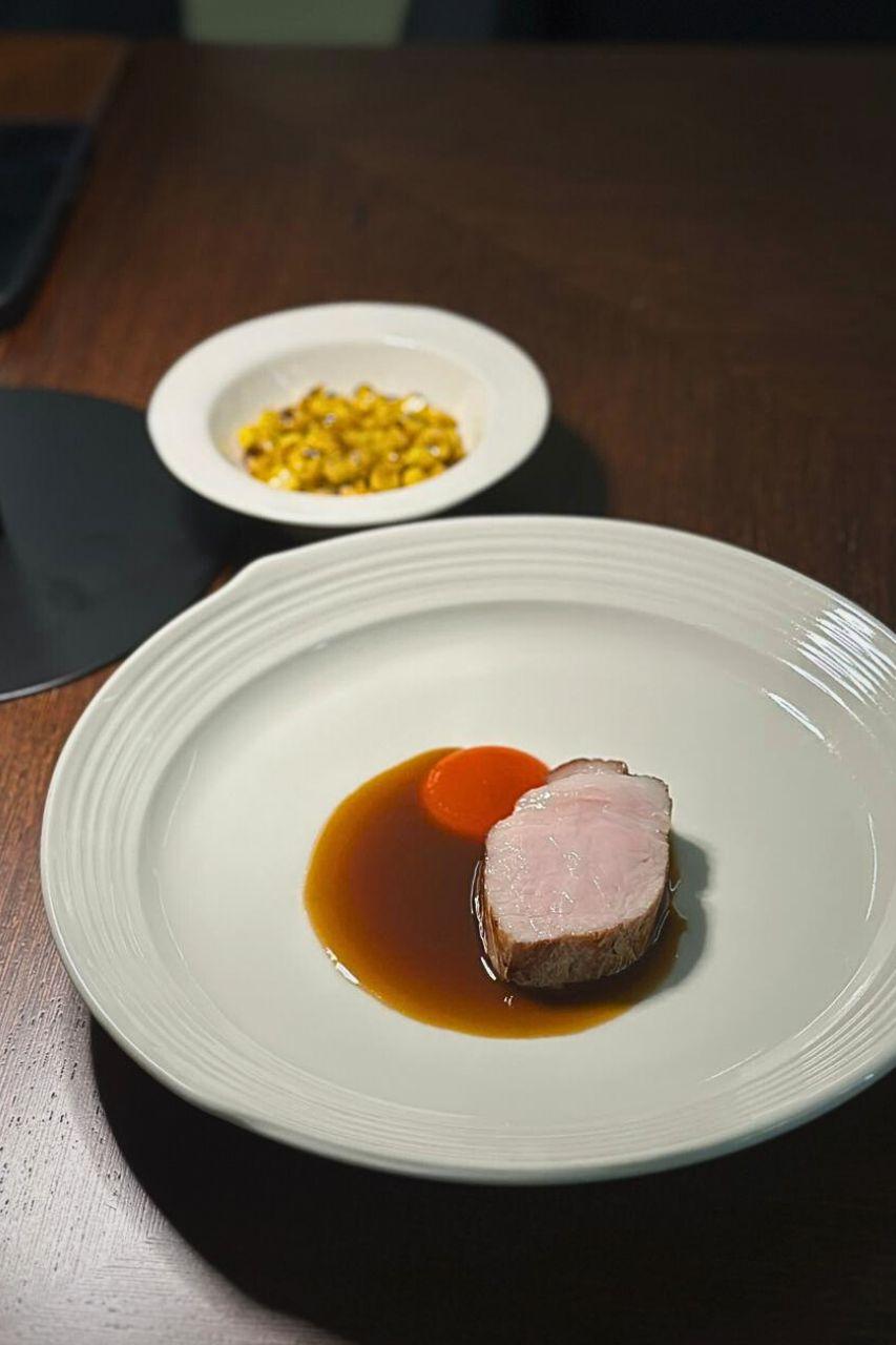 Víno Tre Monti, Thea 2021, s jemnými tříslovinami, kořenitostí a kandovaným ovocem, představuje první červenou variantu večera. Vepřová kotleta z grilu se servíruje s mirabelkovou sweet-chilli omáčkou a doplňovanou intenzivní vepřovou šťávou. Vedle leží klobása Duja, kukuřičné pyré, nakládaná okurka a grilovaná kukuřice. Kombinace kontrastních chutí vytváří vyvážené a harmonické sousto.