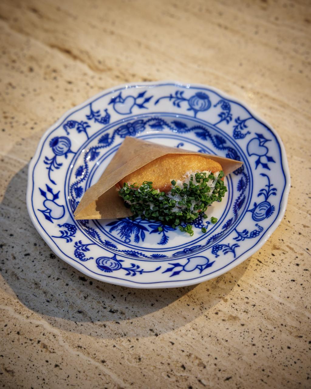 Druhé amuse bouche, „Baohemian“, nasadilo zcela jinou energii. Bao-langosh spojil jemnost asijského těsta bao s rustikální, smaženou duší langoše přirozeně a přesvědčivě. Uzený kečup dodal hloubku, umami mayo zakulatilo celou kompozici a ovčí sýr přidal aromatickou špičku. Nakládané rajče udrželo sousto svěží a lehce kyselé. Výsledkem bylo hravé a odvážné sousto, které plynule spojovalo různé kulinářské tradice.