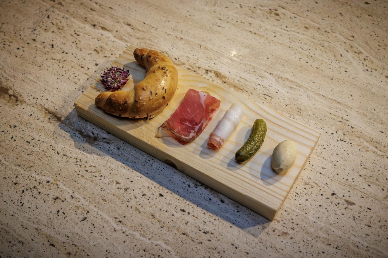 Amuse bouche se neslo v duchu postupně se rozvíjejícího příběhu, který hosty nejprve jemně uzemnil, poté pobavil a nakonec naladil na soustředěnější tóny. Úvodní „Grounding“ působil jako vstupní objetí kuchyně — coppa z vepřové krkovice, hebké uzené sádlo, minipikly a dřeňové máslo vytvořily harmonii slanosti, jemného kouře a kyselé ostrosti. Podávané na dřevěných prkénkách, společně s měkkým pivním rohlíkem, evokovalo domácí atmosféru v elegantním podání.