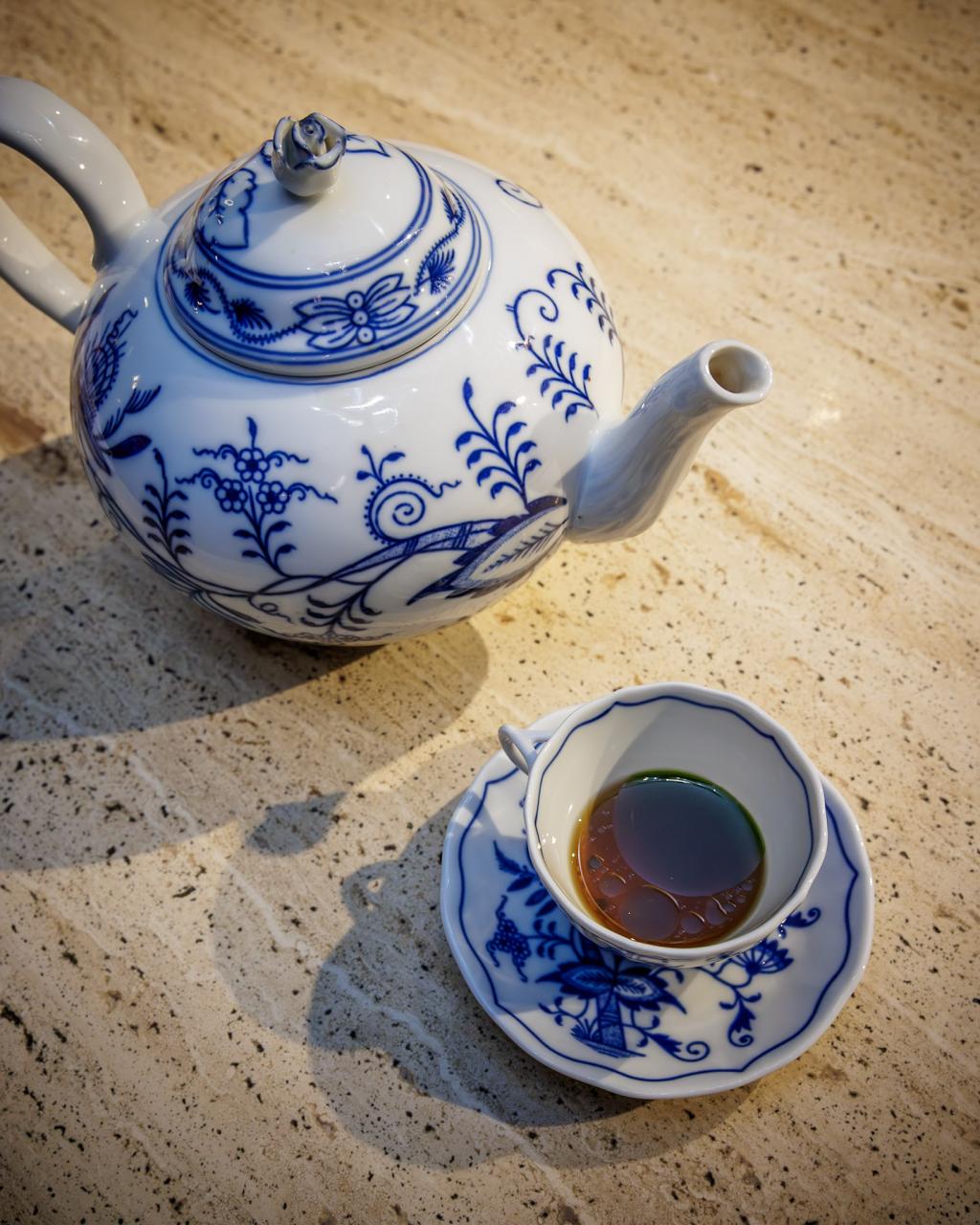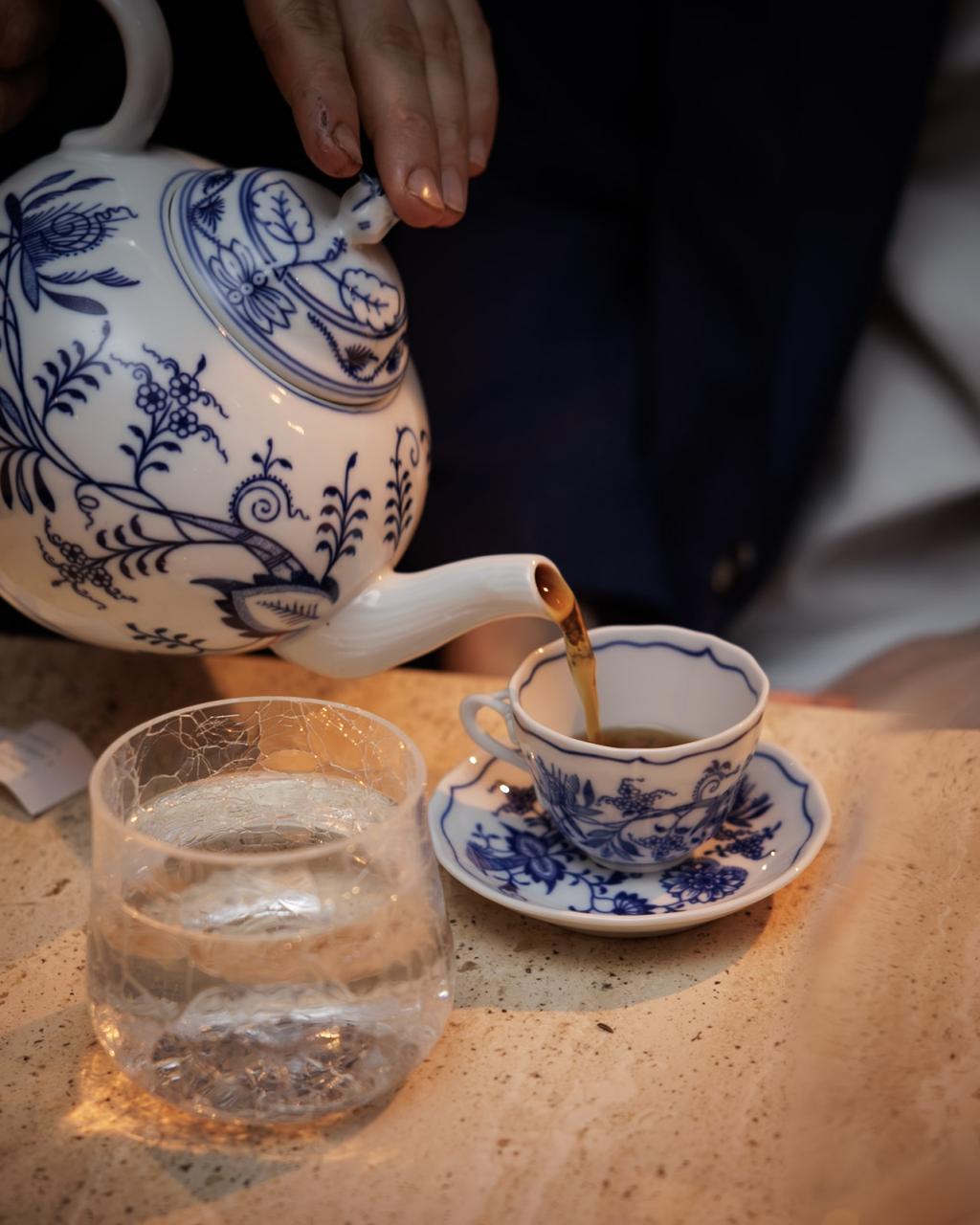 Třetí amuse bouche, „Eel Grey“, přepnul atmosféru do klidnější, meditativní roviny. Třídenní consommé z kostí a pálené cibule s kousky uzeného úhoře mělo hloubku a koncentraci chutí: kouř, minerální slanost, temné tóny cibule a kapka libečkové svěžesti. Podávané jako teplý, uklidňující čaj postupně odkrývalo vrstvy chutí, přičemž Veltlín Bouche „Vinohrádky“ 2023 přinesl minerální přesnost a čerstvou kyselinu, která kompozici elegantně doplnila.