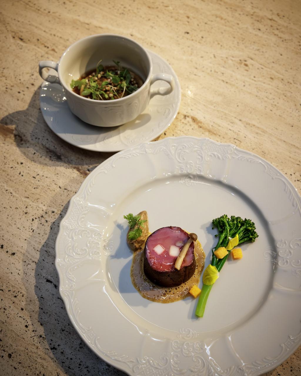 Hlavní chod, „The Untamed“, byl nejdivočejším a nejkoncentrovanějším momentem večera. Srnčí hřbet prošpikovaný divokými houbami s kvasnicemi a omáčkou Alburefa vytvořil komplexní paletu chutí: měkké, šťavnaté maso s jemně nasládlým lesním aroma, hutné umami tóny hub a tlusté, hřejivé nuance omáčky připomínající kakao a podzimní les. Ve vedlejší misce podávané „Bread raviolo“ v consommé ze stařených zvěřinových kostí s houbovým olejem nabídlo současně intenzitu a lehkost. Riesling „Stará hora“ 2022 dodal ostrou, minerální páteř, která zkrotila intenzitu chodu a přinesla elegantní rovnováhu.