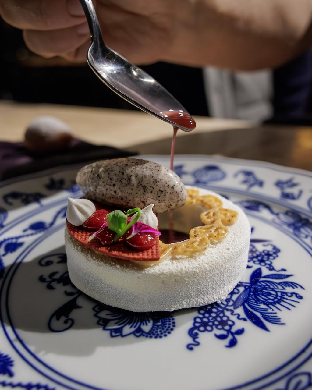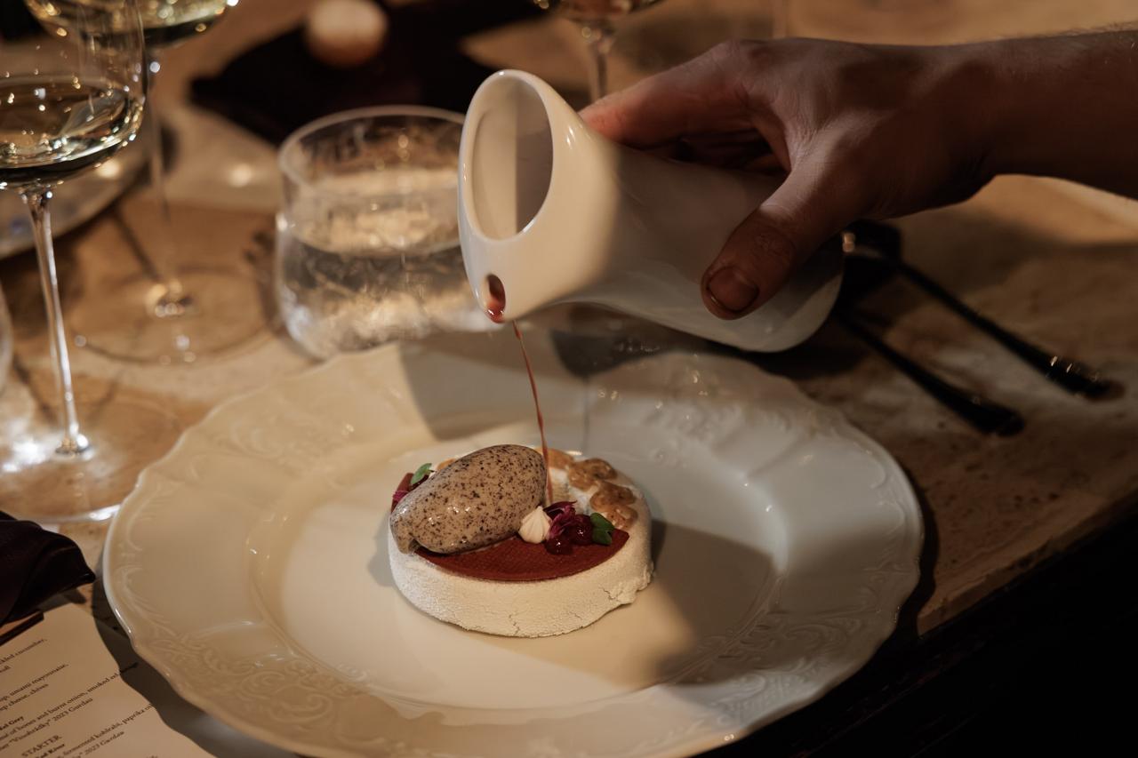 Dezertní část večera nabídla hru i jemnou provokaci. „Opium“ představovalo curd mousse s hydratovanými švestkami, makovou zmrzlinou, pohankovou sušenkou, donutem a makovým čajem, servírované v elegantním kruhu, do jehož středu se zalévalo. Jemná kyselost mousse kontrastovala s hlubokou sladkostí švestek, mak dodával jemnou oříškovou linku a pohanka šustivý, téměř rustikální kontrast. Každé sousto působilo jako malý rituál — sladké, sofistikované a promyšlené. Doprovodný Riesling Cibéby „Stará hora“ 2023 podtrhl komplexitu dezertu svou sladkostí a vůní meruněk a medu, přičemž jeho kyselina udržela celou kompozici vyváženou.