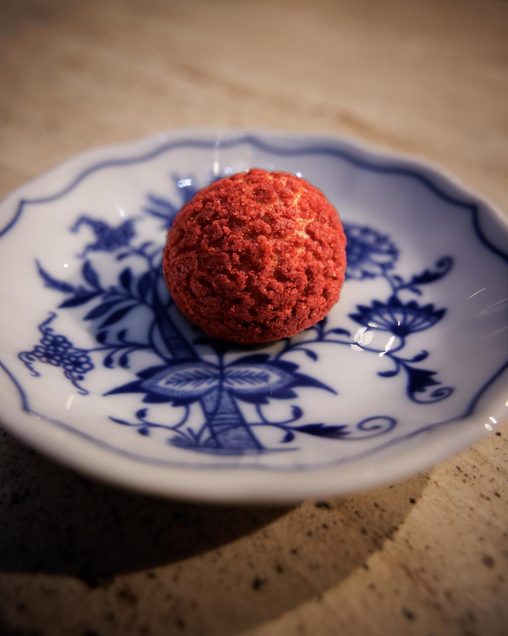 Závěrečnou tečkou večera byl „Carp Supremacy“ — choux bonbon s vepřovou krví a ruby čokoládou, servírovaný na decentním polštářku, který vyžadoval plnou pozornost. Ruby čokoláda vytvořila ovocnou linku, zatímco vepřová krev dodala jemný kovový tón, který sladkost stabilizoval. Finální gesto večera doplnil člověk převlečený za rybu, který hosty „lovil“ udicí, a nabízel poslední sousto. Moment přinesl hravost, absurditu a ironii, typickou pro styl Piknikon. Michelinští šéfkuchaři zažili nečekané, a přesto dokonale promyšlené zakončení hostiny.