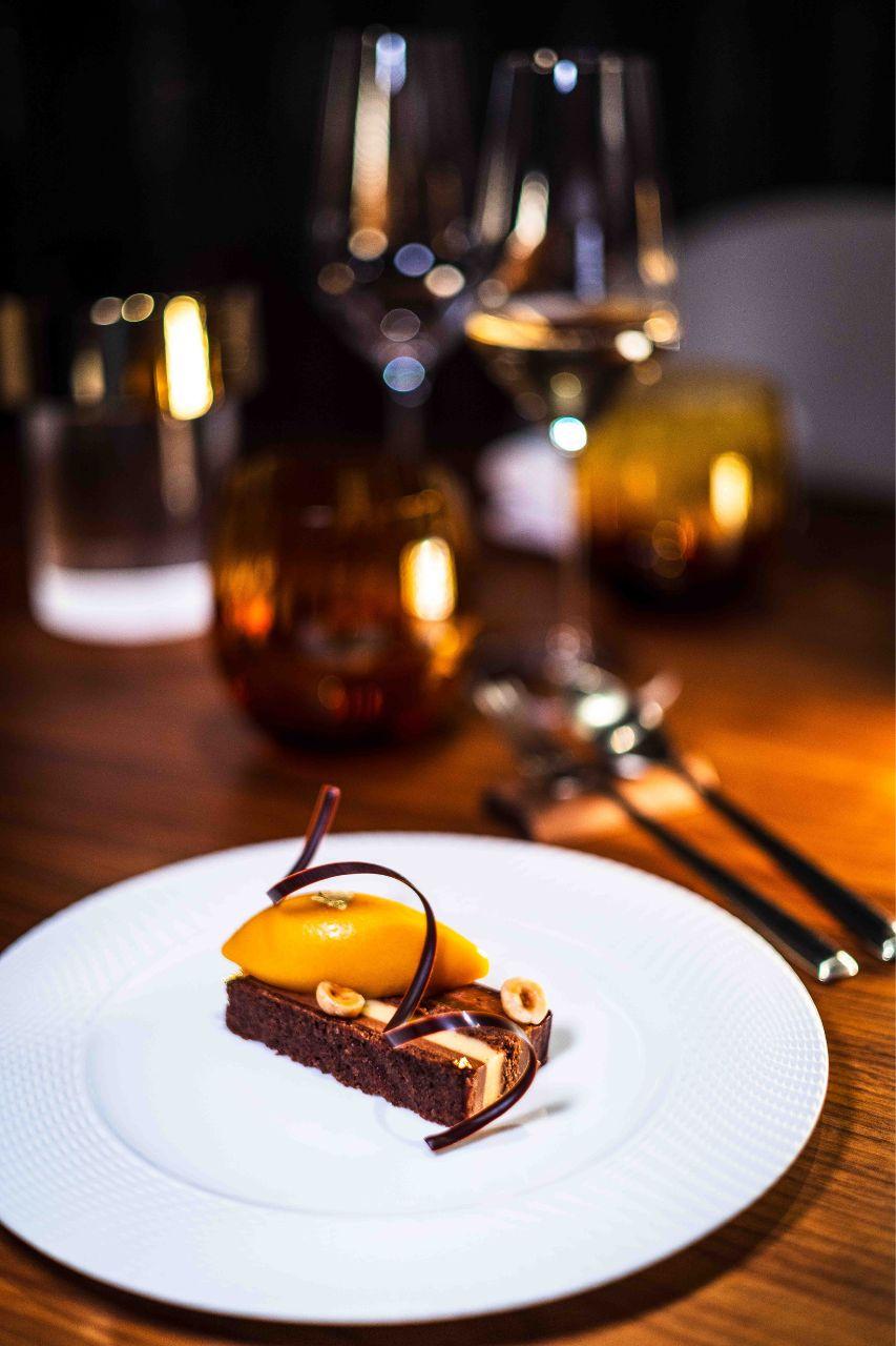 Na povrchu leží ozdoba z čokolády, lískový oříšek a dotek meruněk. Uprostřed je čokoládový piškot s subtilním citronovým tónem, jenž dezertu přidává svěžest, a vše završuje meruňkový sorbet, který přináší ovocnou kyselinku a krásně vyvažuje hutnější vrstvy. Motiv „Zlaté Prahy“ doplňuje i jemná aplikace jedlého zlata, působící jako drobný návrat ke staré škole hotelové gastronomie — tentokrát však s moderním citem.