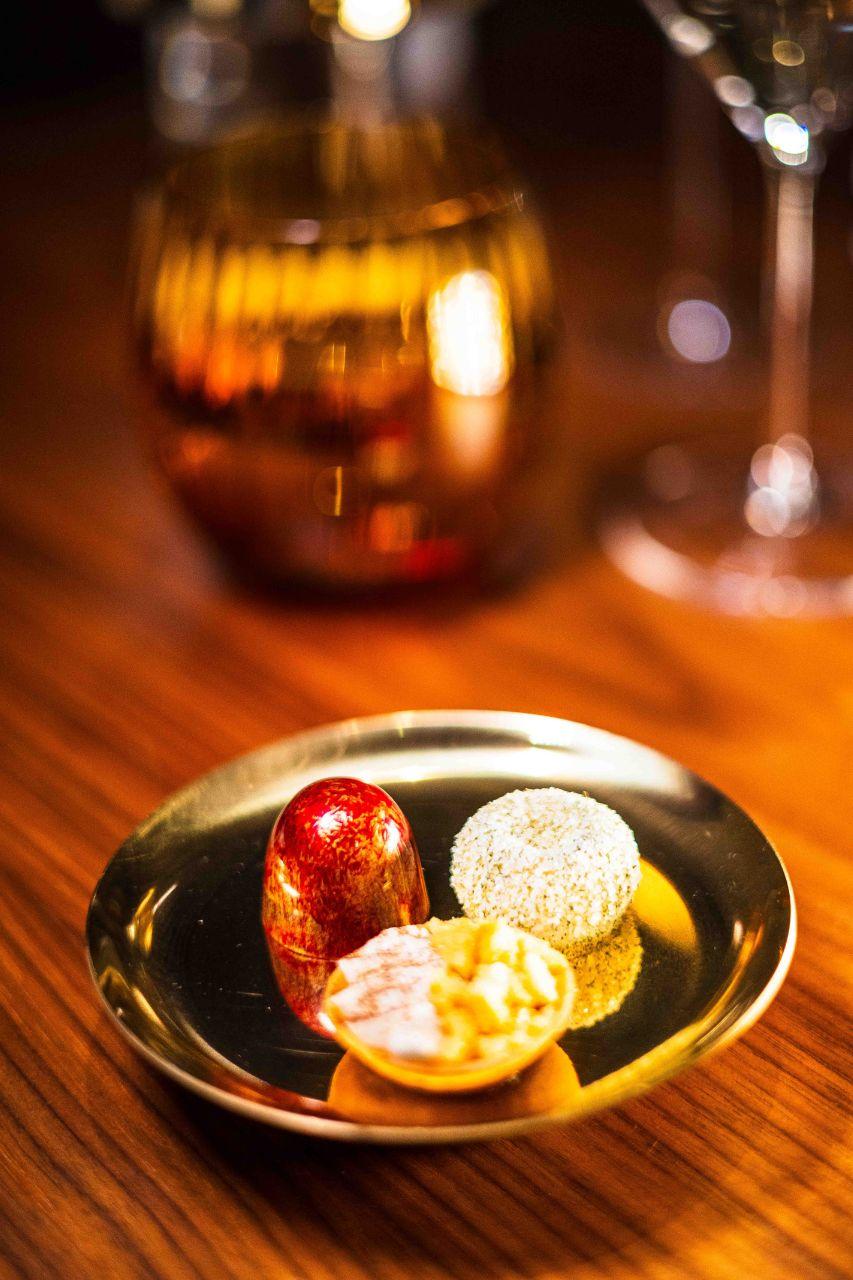 Jako poslední sladký akord večera přichází Petit Fours, podávané v elegantním Dražéboxu, který funguje nejen jako vizuální tečka, ale i jako malý digestiv po hlavním menu. Nejblíže k hostu se na malém etažéru usadila hrušková tartaletka s vanilkovým krémem, medem a náznakem hřebíčku — kombinace sladkosti, květinové vůně a lehkého kořeněného náznaku, která příjemně uzavírá předešlé dezerty. Vedle ní se nachází čokoládová pralinka s brusinkou a skořicí, jejíž ovoce a koření přidávají svůdně kontrastní kyselost a naznačenou pikantní linku, která probouzí patro a připravuje ho na poslední zážitek.