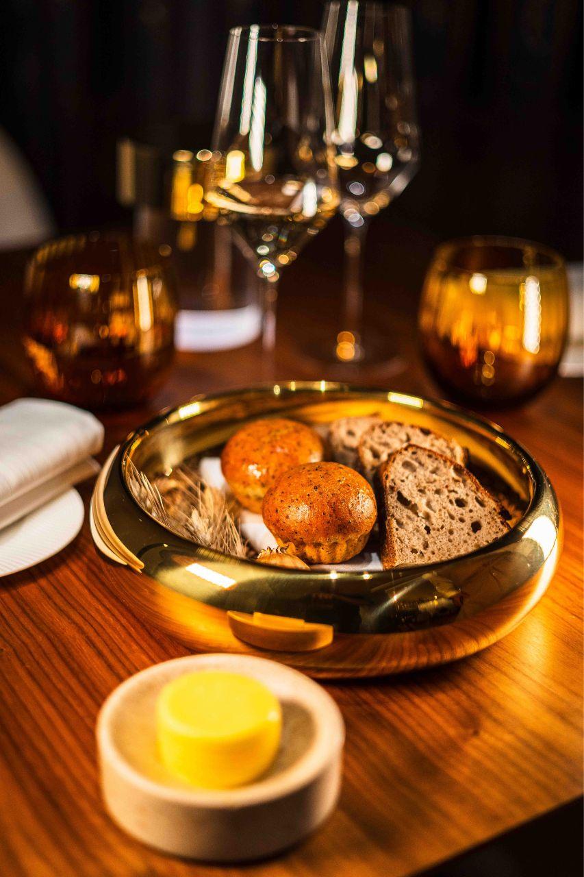 Chlebový servis začíná Kváskovým chlebem Šumava se žitno-pšeničným charakterem, bramborou a kmínem nabízí hutnou, rustikální chuť s vláčnou střídou. Mléčný chlebík ve stylu odlehčené briošky je jemnější, mírně nasládlý, s krásným aromatem tymiánu, máku a smažené cibulky. Oba chleby pojí solené máslo s kulturou, které díky lehce nakyslé stopě zvýrazní jak pečivo, tak chutě dalších chodů. Chlebový servis funguje jako most mezi canapés a prvním chodem — lehký, ale přitom s charakterem.
