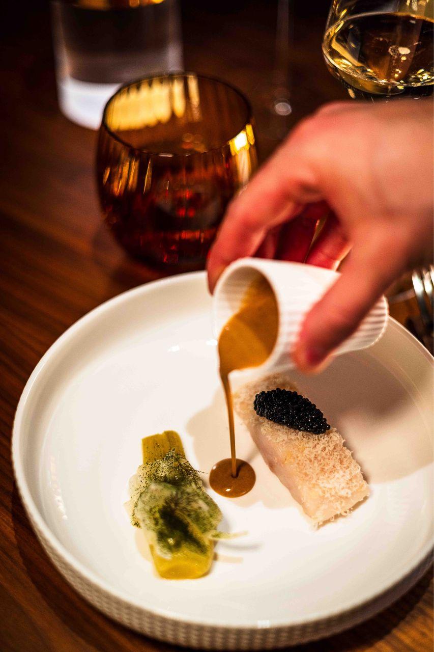 ...proto jsme rádi za jesetera, kterého přináší hlavní rybí chod. Patří k nejchutnějším momentům večera — rybu masitou, pevnou, s charakterem téměř bílého masa. Pochází od pana Kalendy z Chabrybárny a jeho původ sahá k rybářství Holohlavy, což mu dává čistý, příjemně minerální profil. V kuchyni je jeseter pošírován v estragonovém másle, díky němuž získává bylinnou linku a elegantní šťavnatost, aniž by se narušila přirozená hutnost masa. Povrch ryby je posypán strouhanou uzenou mandlí, jejíž kouřová, lehce sladká vůně se okamžitě propojuje s rybími tóny. Na vrchu se objevuje také decentní množství kaviáru, jen tolik, aby přidal jodový akcent a sůl, ne aby vše převálcoval.