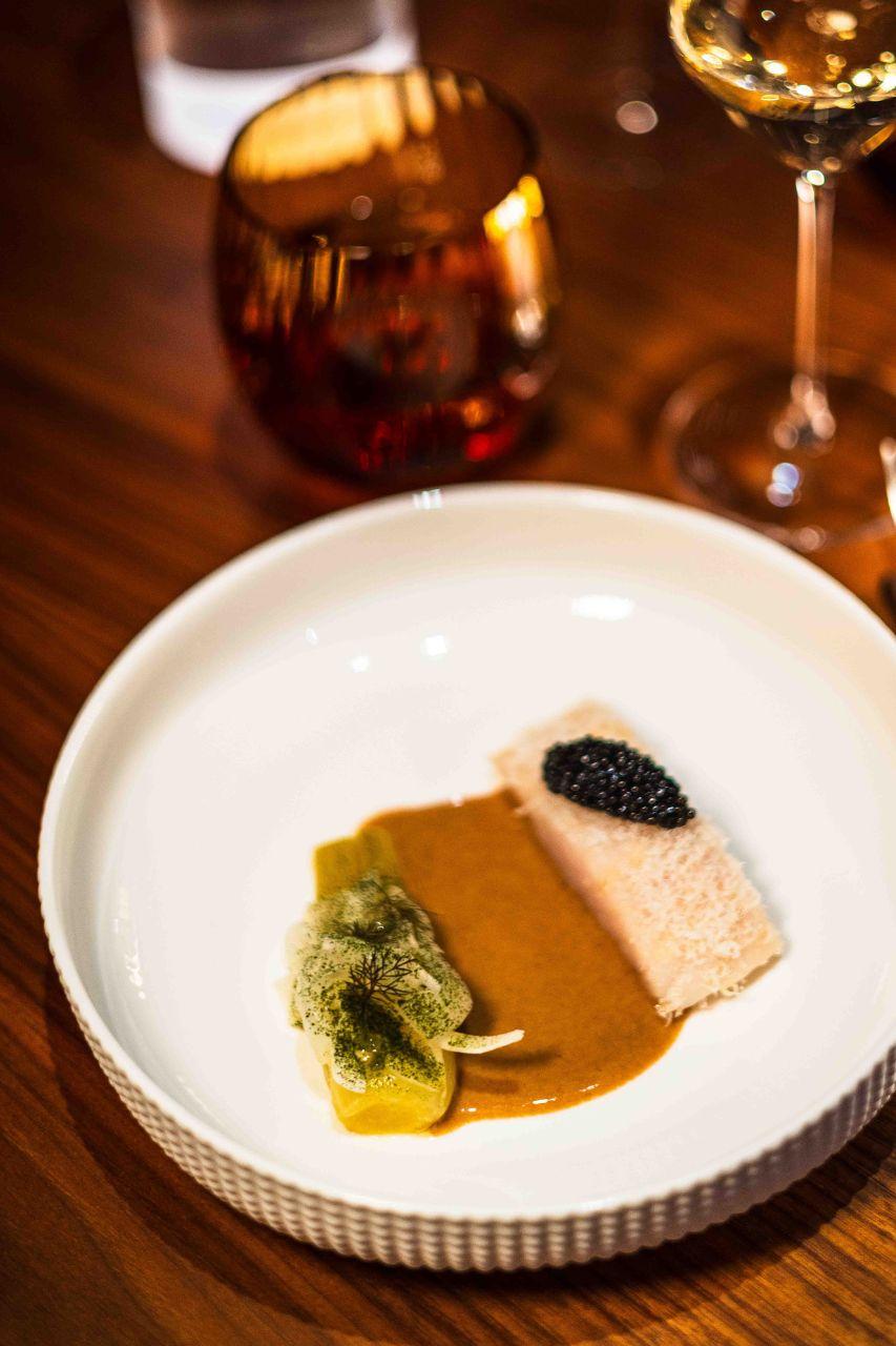 Startujeme pohankovým krekrem s uzeným úhořem, černým česnekem a rýžovým octem. Zemitost pohanky se propojuje s bohatou, téměř máslovou texturou uzeného úhoře. Černý česnek přidává balsamikovou sladkost a jemný kořenitý podtón, zatímco rýžový ocet celé sousto rozjasní a dodá mu svěžest. Bylinky — kerblík, kopr a pažitka — vnášejí zelenou, aromatickou svěžest. Úvodní sousto působí překvapivě komplexně, přitom však zůstává lehké a hbitě osvěžující.