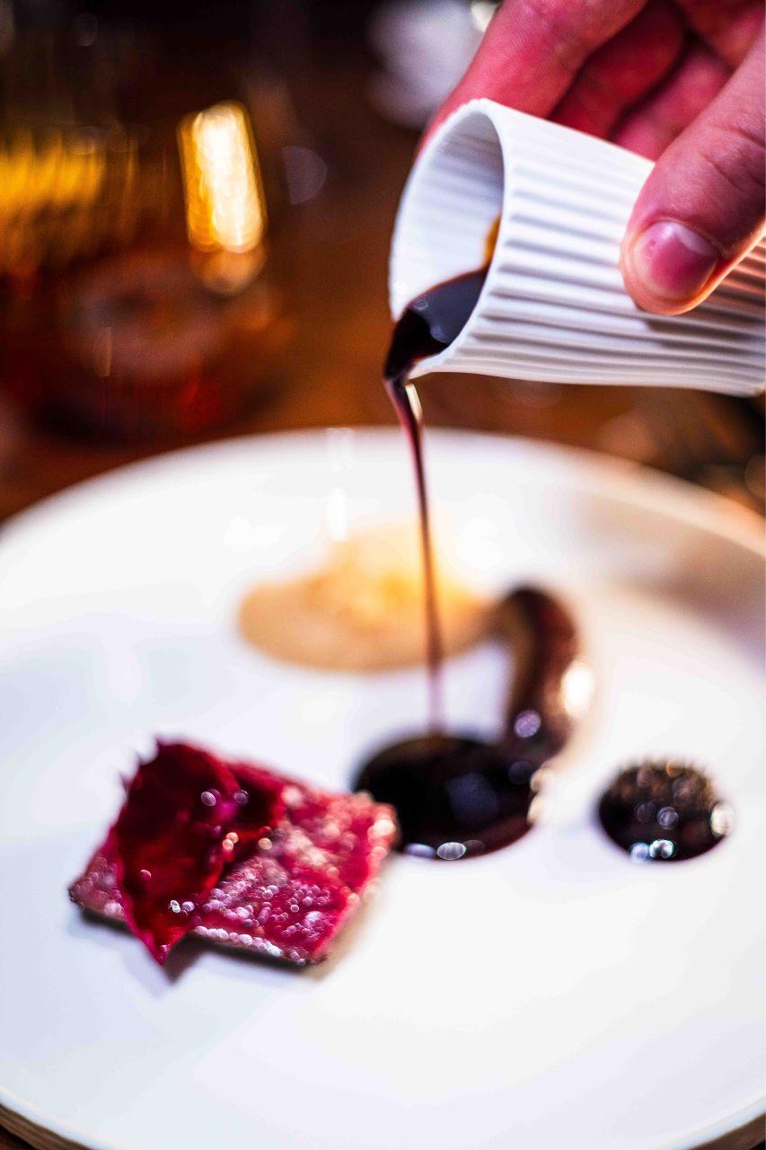 Talíř doprovází celer ve dvou podobách — nadýchané pyré a křehká „sláma“, tedy tenké fritované proužky, které přidávají texturu a lehce zemitou vůni. Vpravo dole se objevuje kandovaná borovicová šiška, drobný detail, který se nevyjímá jako dekorace, ale jako koncentrovaný nositel chuti: sladká, pryskyřičná, kořenitá. Pod ní leží Pontack - kečup z černé bazy, tmavý, aromatický, s vůní lesa po dešti. Je to prvek, který propojuje sladkost se zvěřinou a dodává pokrmu zajímavou, téměř tajemnou linku. Celý chod tak působí jako vyprávění o zimním lese — vrstevnatý, aromatický, plný tepla, ale zároveň přísné elegance.