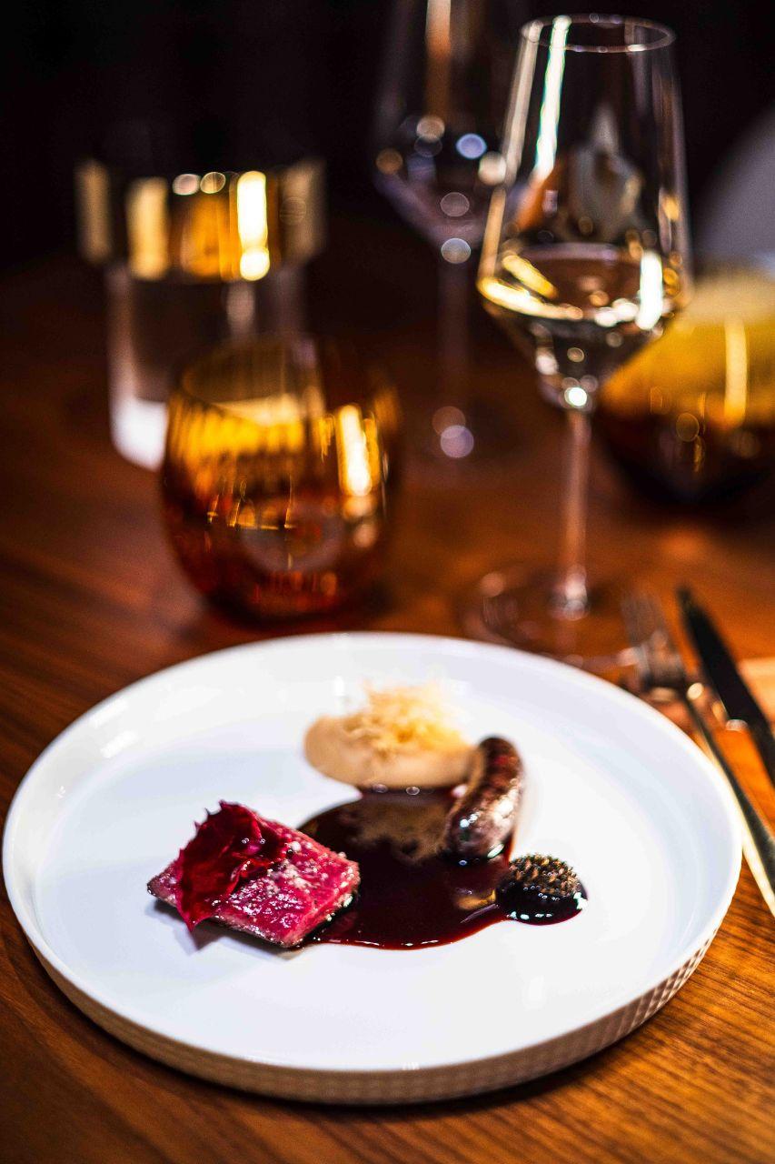 Hlavní masový chod staví na daňkovi, který přichází v dvojí podobě: jako čistý, šťavnatý hřbet a jako drobná, ručně vyráběná klobáska z kýty. Hřbet je upraven tak, aby si uchoval svou výrazně zvěřinovou, ale přitom elegantně měkkou strukturu. Klobáska je technickým detailem, který stojí za zastavení — kuchyně si ji vyrábí sama a používá při tom to nejjemnější střívko, jaké je možné sehnat. Směs z kýty daňka obsahuje pažitku, rozmarýn a jalovec, tedy koření, které zvýrazní přirozenou lesní aromatiku masa. K tomu se přidáva tučná část pražské šunky, které dodají šťavnatost a umami, a nakonec kapka brandy, která masu dodá ušlechtilou, lehce karamelovou hloubku.