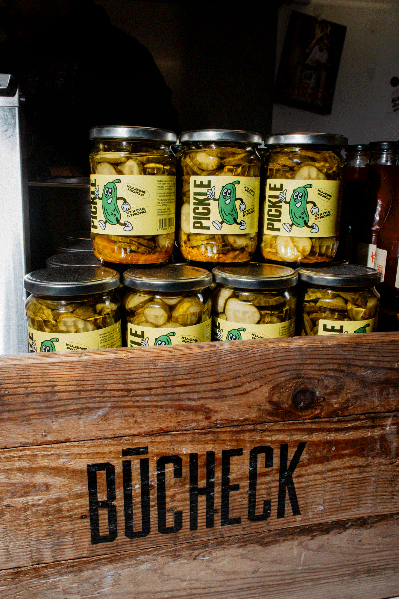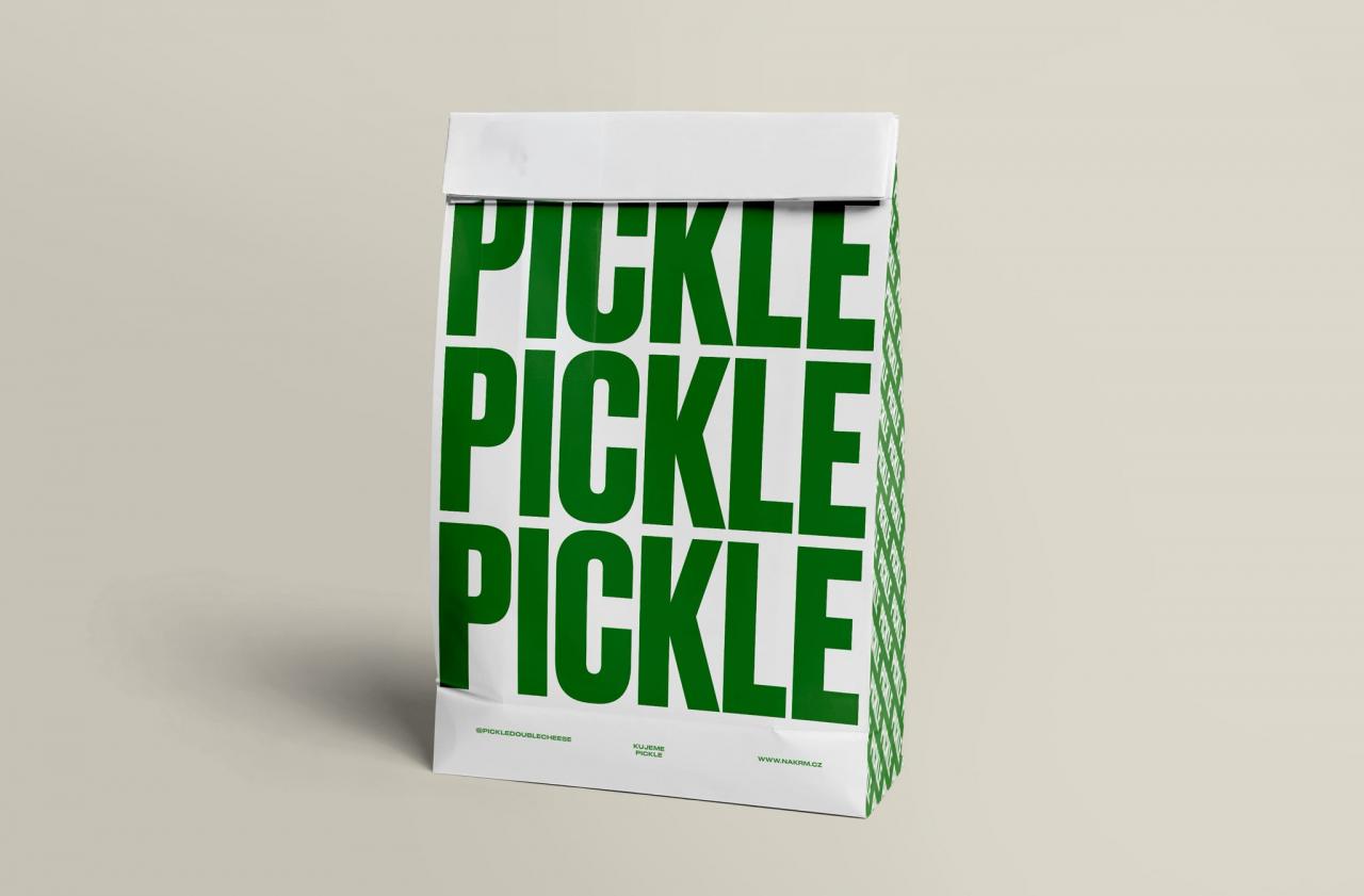 Vzniklo to hodně pocitově, jak to děláme vždycky. Ale zároveň jsme nad tím tentokrát přemýšleli víc byznysově. Pickle nejdřív vzniklo jako produkt – ty okurky. A někde vzadu už jsme věděli, že se tak jednou může jmenovat podnik. Líbilo se nám, že to má postavičku, že je to sympatické, že to funguje vizuálně. Ty bílo-zelené barvy, že se to dá použít na produktu i na prostoru.